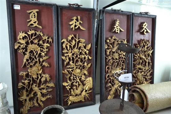 A SET OF FOUR GILT WOOD WOODEN PANELS, THE FOUR SEASONS, circa 1900, each panel measures 54.5 x 21.5cm