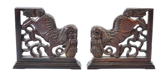 A PAIR OF WOOD CARVED FO DOG PLAQUES, 48cm high