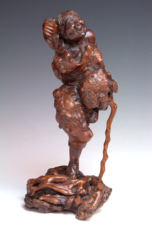 A CARVED ROOTWOOD FIGURE OF LOHAN, modelled with one leg raised, leaning on his staff, 27.5cm high