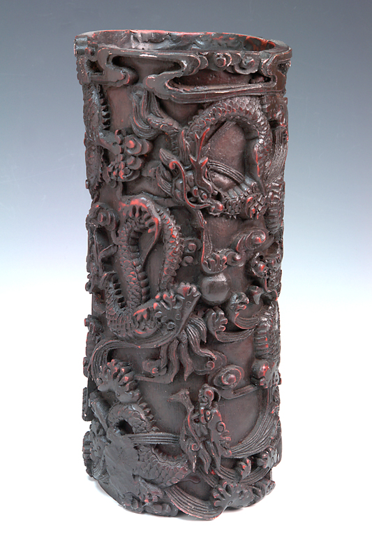 A LARGE CARVED BAMBOO BRUSH HOLDER, carved dragon motif, 29cm high