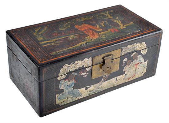 A CHINESE LACQUERED AND HAND PAINTED BOX, 14cm high, 35 wide