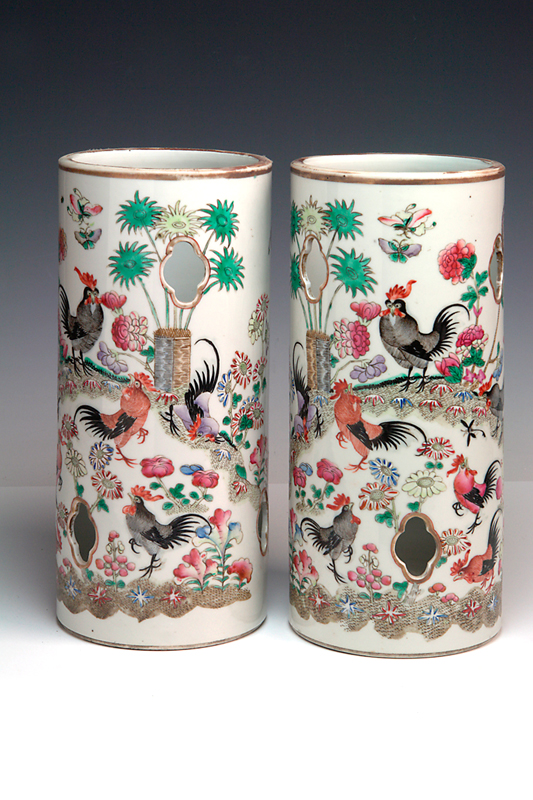 A PAIR OF 19TH CENTURY FAMILLE ROSE HAT STANDS, painted cockerels among flowers and trees 28 x 10.5cm diameter each