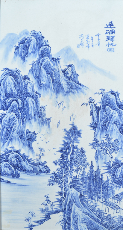 A FRAMED BLUE AND WHITE PORCELAIN PLAQUE, MOUNTAIN LANDSCAPE, 20th century 68.5 x 43cm