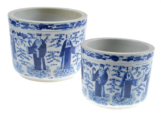 A PAIR OF CHINESE BLUE AND WHITE GRADUATED JARDINIERES, with immortals scenes, the largest 16.5cm high