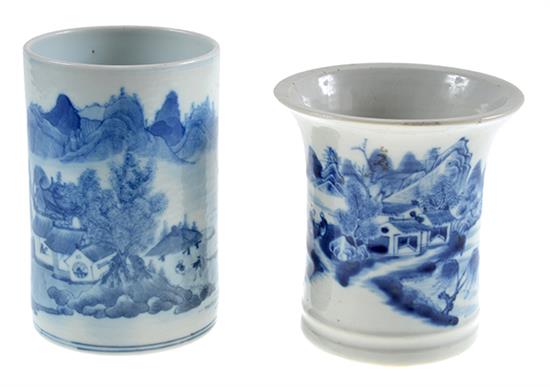 A CHINESE PORCELAIN BLUE AND WHITE BRUSH WASHER AND VASE, the tallest 13.5cm high