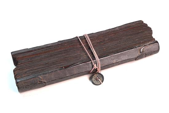 A BALINESE PALM LEAF PRAYER BOOK, text scratched into size-cut palm leaf pages, an old coin with closure string