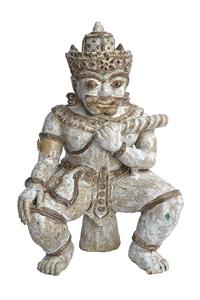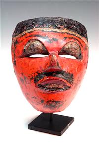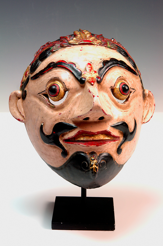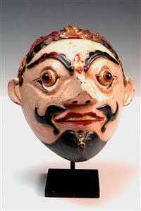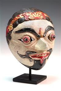 FOUR JAVANESE DANCE MASKS AND A CERAMIC FIGURE, The largest mask 30 x 16.5cm