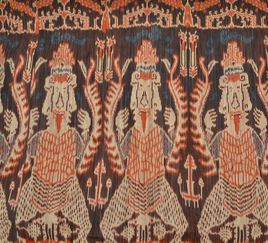 A SUMBA ISLAND IKAT CLOTH, CIRCA 1900, decorated with repeating totem figure, tongue outstretched 223.5 x 213cm