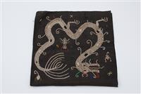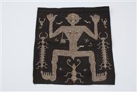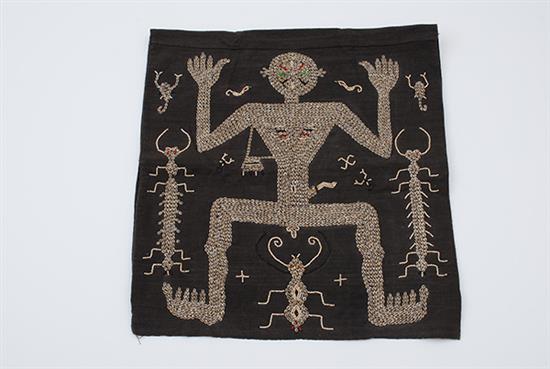 A SUMBA ISLAND FEMALE SHAMAN'S SHIFT, hand woven black cotton decorated with large ancestor flanked by scorpions and lizards, other side large dragon with cockerel and centipede, 109cm long