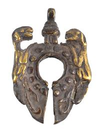 A SMALL COLLECTION OF TRIBAL JEWELLERY, including a pair of Selaru island bronze armbands, Kalimantan bronze pendant, silvered amulet and Balinese dancers anklets