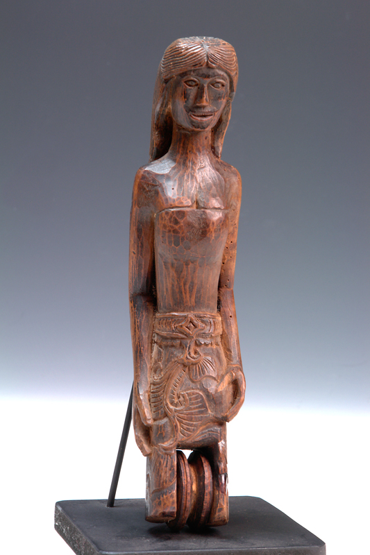 A BALINESE LINE MEASURE, carved female figure, long hair, at base a wheel for reeling off thread, top perforated to hold/suspend thread, one thumb chipped, 20cm high