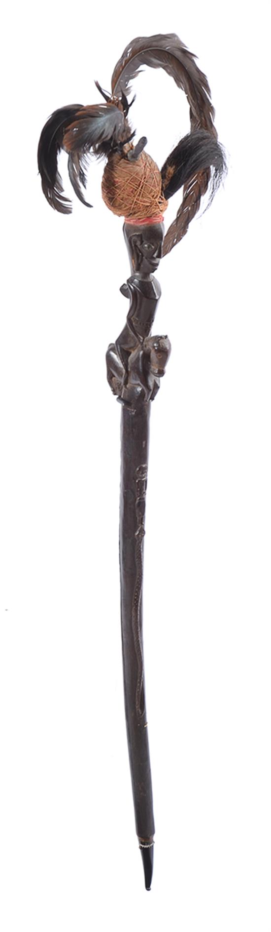 A BATAK CHIEFTAINS STAFF, the finial a carved horse and rider with feathered headdress, a small carved totem figure and snake to staff, 95cm hgh