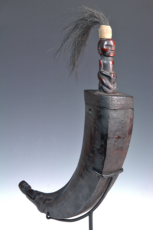 A BATAK SHAMAN'S BUFFALO HORN, at tip a figure riding a crocodile, totem figure finial with a goat hair tuft on head held by wound cloth, 48cm high