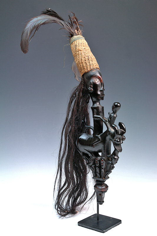 AN ELABORATE SUMATRAN BATAK STOPPER, ancestor rider on a goat with his son facing him, plaited vegetable fibre headgear topped by cockerel feathers, 33cm high