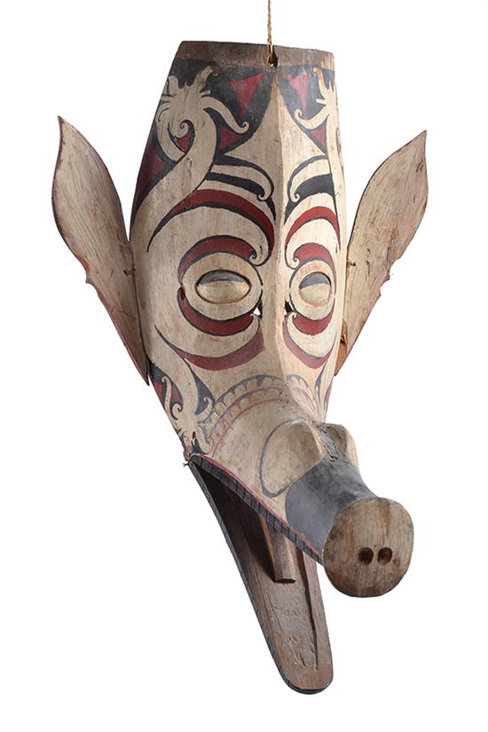 AN IATMUL MWAI MASK, MIDDLE SEPIK RIVER, 20th century, elongated nose ending with a small birds head, minor wood damage on side as v...