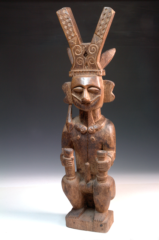 A MALE NIAS ANCESTOR FIGURE, elaborate head gear, holding a ceremonial vessel in each hand, one large pendulous earring reaches shoulder, moustache, typical regional neck bank 66cm high