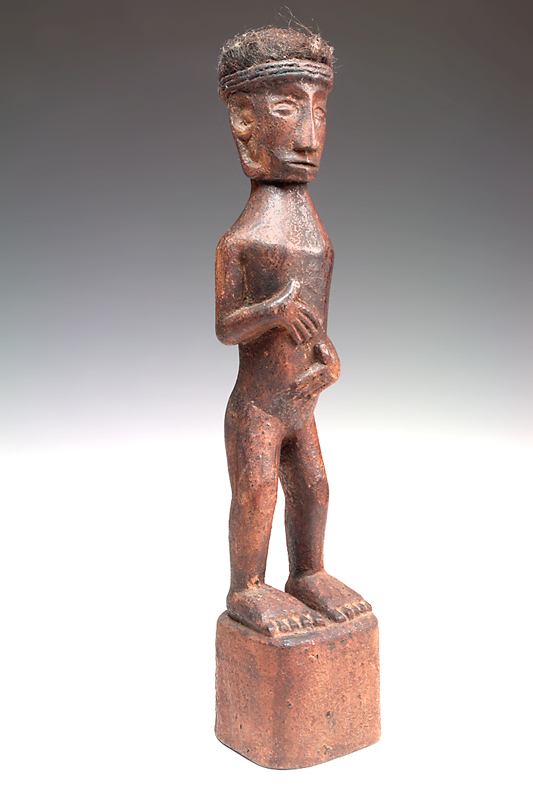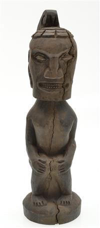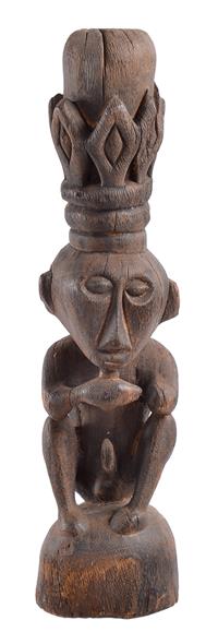 THREE WOODEN BATAK FIGURES, including seated figure, ancestral figure and Sumantran figure with applied human hair 40.5cm high