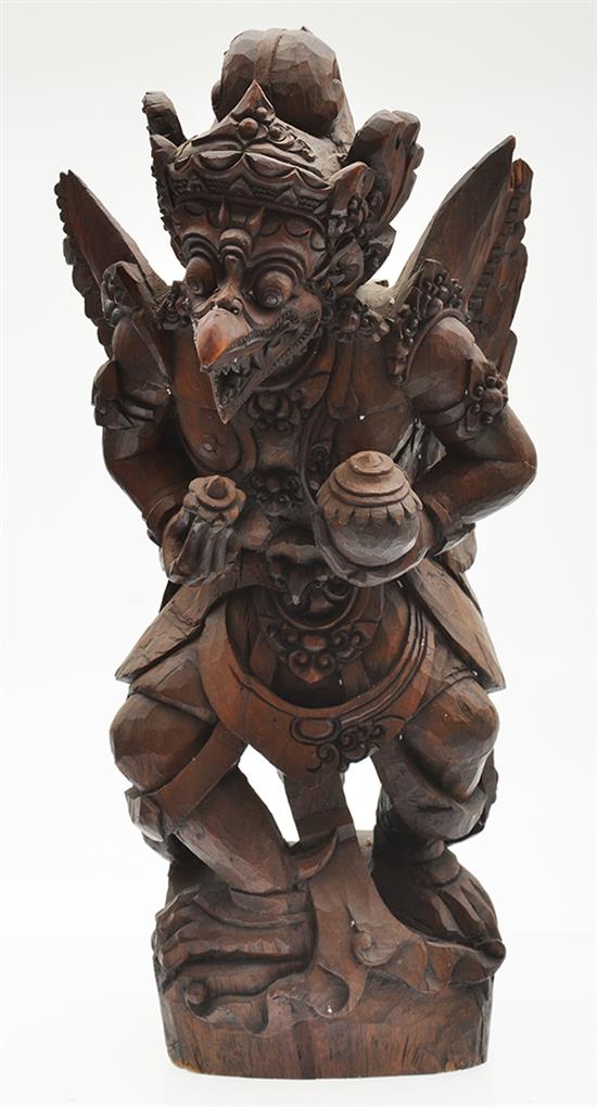 A LARGE BALINESE KRIS HOLDER, GARUDA, with symbols in hands, elaborate headgear, one wing chipped 61cm high
