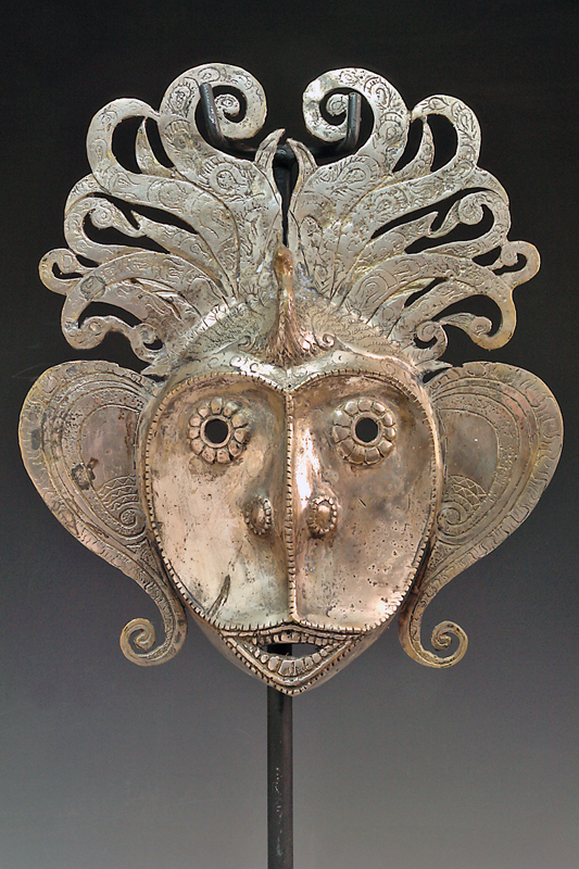 A BALINESE SILVER ALLOY MASK, with an elaborate crown 30.5 x 25cm