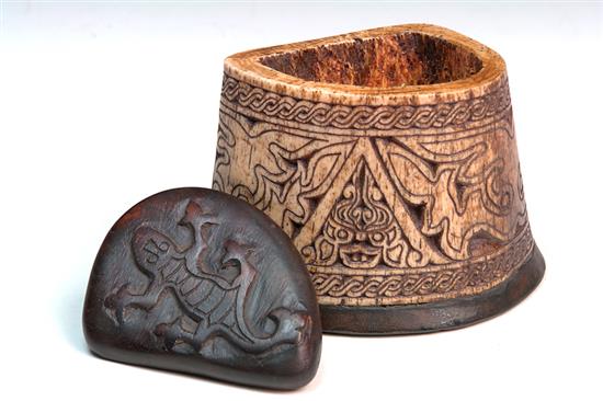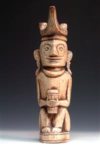 A COLLECTION OF SEVEN BONE CARVED OBJECTS, including bottle stopper, Nias island ancestor figure, shaman's elephant bone potion box, a figural group of Lombok island ancestor figures, a batak lime container and a pair of articulated wedding figures, the latter 10.5cm high