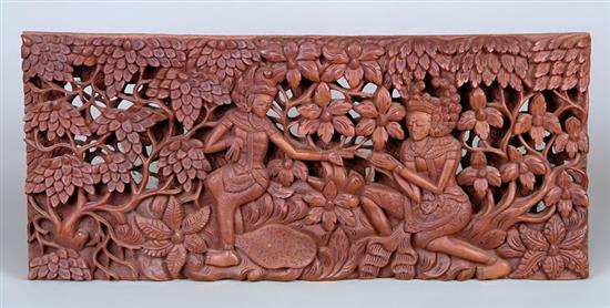 A CARVED BALINESE DECORATIVE PANEL, depicting a scene from the Rama & Sita legend 68.5 x 30cm