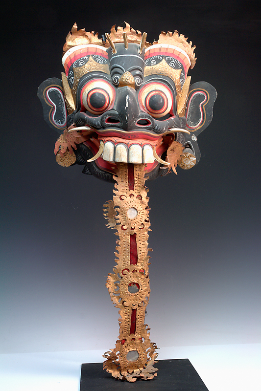 A BALINESE LION MASK, a flaming gold-painted tongue, large teeth, flap-ears, bulging eyes 67cm total length