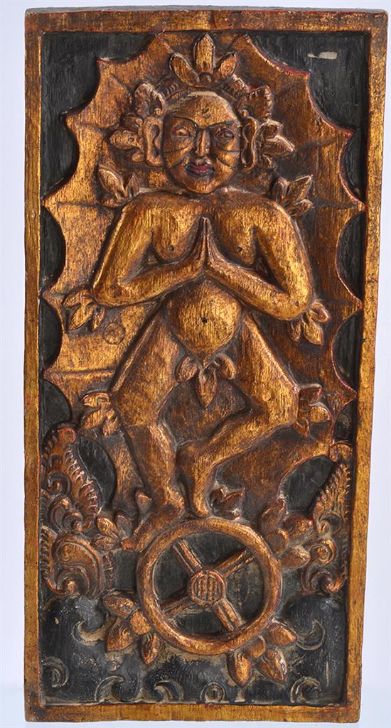 A MALAYSIAN GILT WOOD HINDU KRISHNA PLAQUE, trisula on head, standing above a wheel of life, 50.5 x 35.5cm
