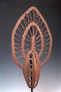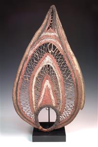 THREE MAPRIK YAM HARVEST FESTIVAL MASKS AND AN ABELAM WOVEN HEAD ORNAMENT, the latter 63.5cm high