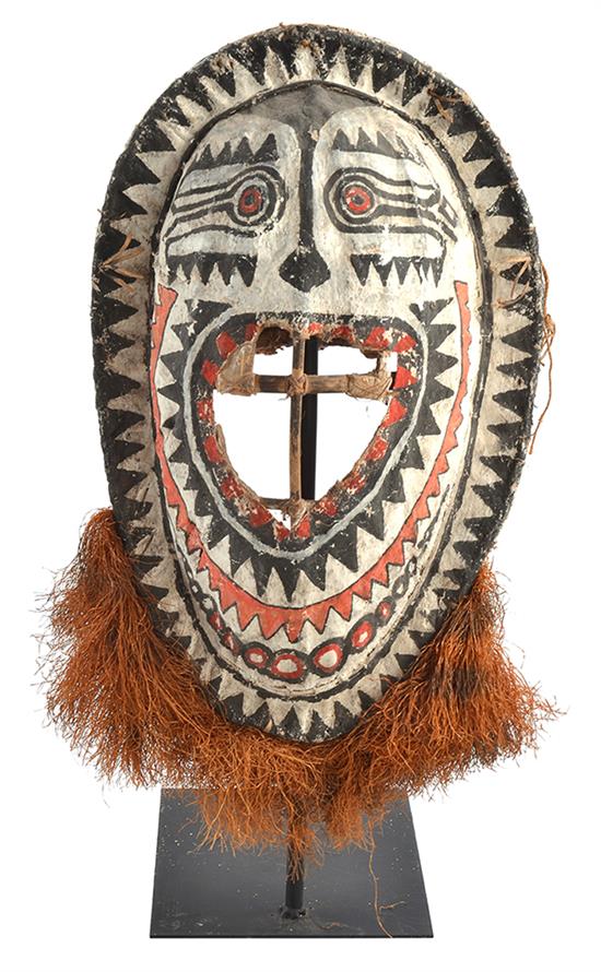 A TAMI ISLAND TAPA DANCE MASK, inside rattan frame, large opening for mouth and eyes, painted face back & front, with shark tooth motif around front and back, rafia beard, 58 x 30cm