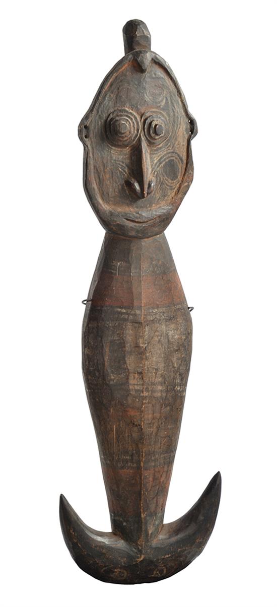TWO MIDDLE SEPIK FIGURAL SUSPENSION HOOKS, the largest 94cm high