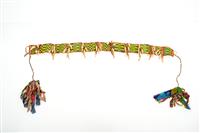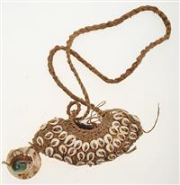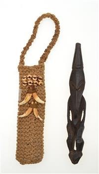 A SMALL COLLECTION OF BODY ORNAMENTS, including cowrie shell and opossum skin headband, pigs tooth belt, comb, witch doctors amulet bag and small totem figure housed in pouch