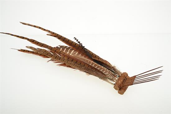 A NEW GUINEA COMB, wooden spines with plaited rattan strip top and two balsawood rods, studded with pheasant feathers, and one Bird of Paradise feather