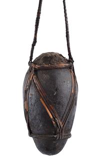 A WEST NEW BRITAIN SAGO LADLE AND OIL CALABASH, the latter 54.5 cm high