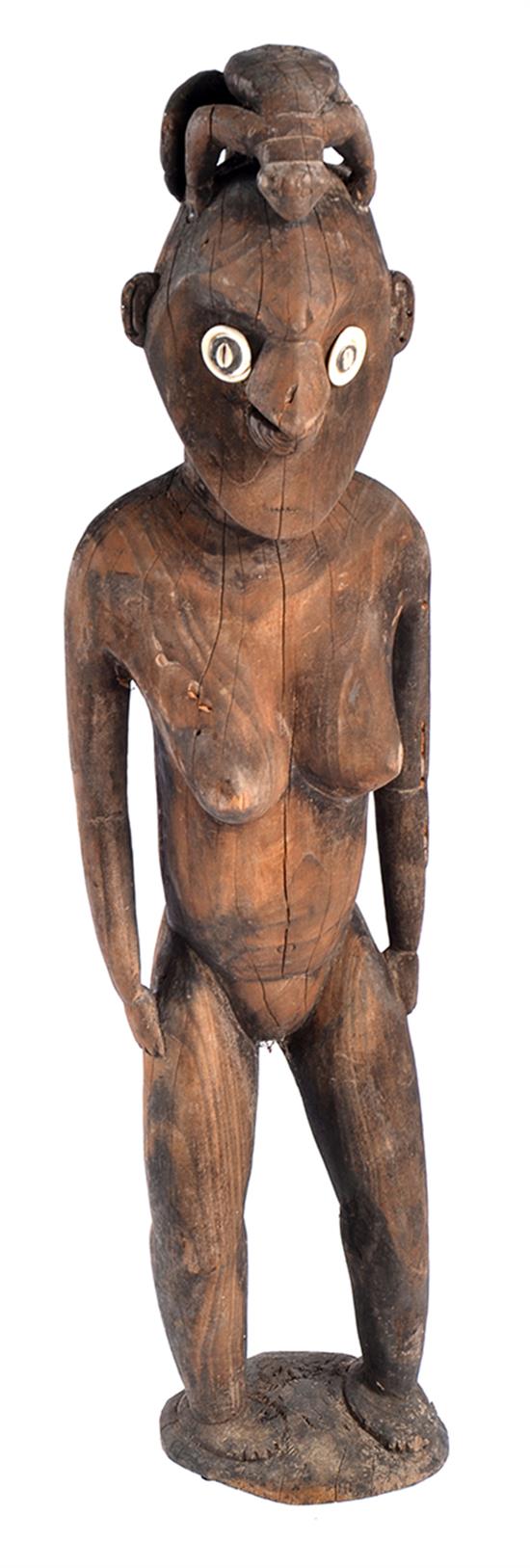 AN EAST SEPIK FEMALE ANCESTOR FIGURE WITH A TOTEM OPOSSUM ON HEAD, TAMBANUM VILLAGE, cowrie shell and concus shell-disc eyes, a chip missing from base, 99cm high