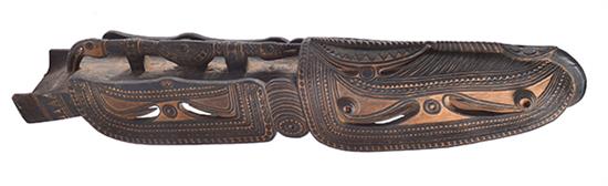 A LARGE UPPER SEPIK SWAGUP VILLAGE CANOE PROW DECORATION, at end, stylised crocodile, at sides, regional ornamental carvings, 147cm long
