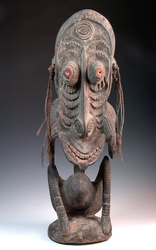 A CROUCHING MIDDLE SEPIK ANCESTOR FIGURE, PNG, elongated face prominent eyes and nose, hands holding chin, vegetable fibre strands from ears, a raised round forehead decoration, handle at back, 68.5cm high