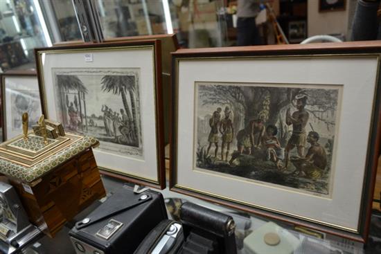 THREE 19TH CENTURY PRINTS OF NEW GUINEA, A New Guinea dead house & Inboorlingen van Nieuw- Guinea, largest 28 x 35.5 cm, including frame