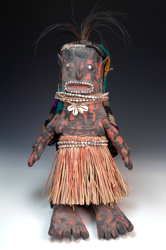 A SOUTHERN HIGHLANDS MENDI PAYBACK FIGURE, raphia skirt, ample jobs tear seed decoration, cassowary feathers on head, plaited fibre bilum basket at back of head, 48cm high