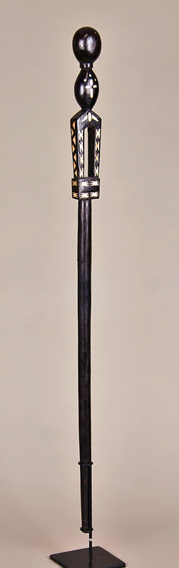 A SANTA CRUZ MISSIONARY STAFF, with mother-of-pearl inlay on all four sides, an inlaid cross at finial 85 cm long