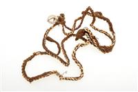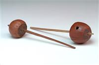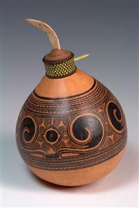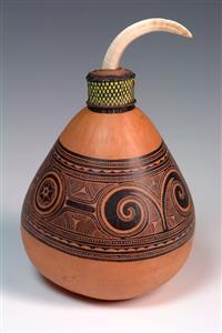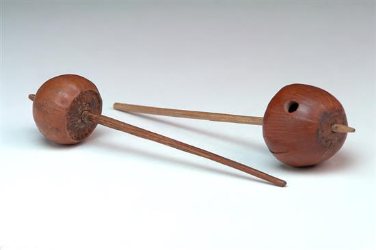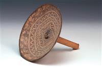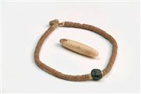 A COLLECTION OF PAPUA NEW GUINEAN OBJECTS, including a New Britain spinning top, Trobriand Islands mortar & pestle, two Massim region lime containers,shell currency money, coconut shell spinning top and lower Sepik woman's nose bone. The coconut shell spinning top 8.5 cm diameter