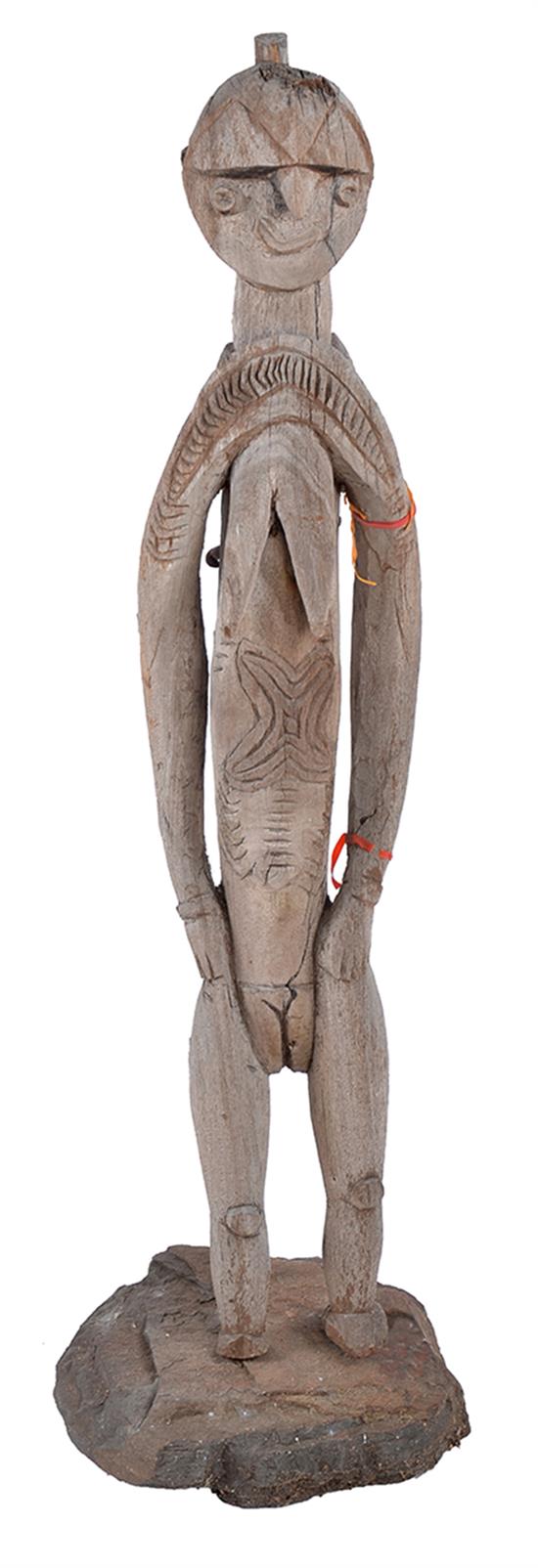 A PNG WASHKUK REGION NOKWI CEREMONIAL ANCESTOR FIGURE, small head with raised facial features, raised knees, carved tattoo marks around navel and shoulders, one foot chipped, as visible 119cm high