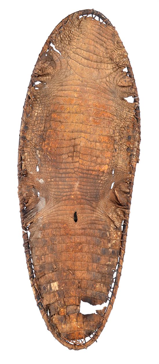 A LARGE KWOMA, EAST SEPIK PROVINCE CROCODILE FIGHTING SHIELD, bamboo frame, claws visible at sides, 152 x 59.5cm