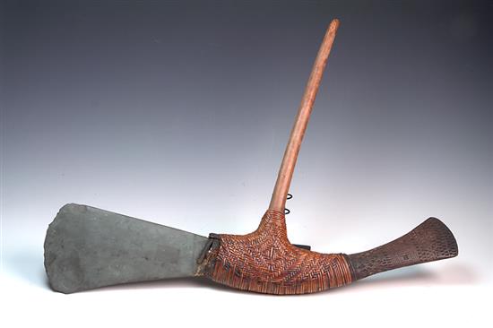 A NEW GUINEA HIGHLANDS CEREMONIAL AXE, handle with rattan strip binding, blade slightly chipped as visible, 78.5 x 68.5 cm