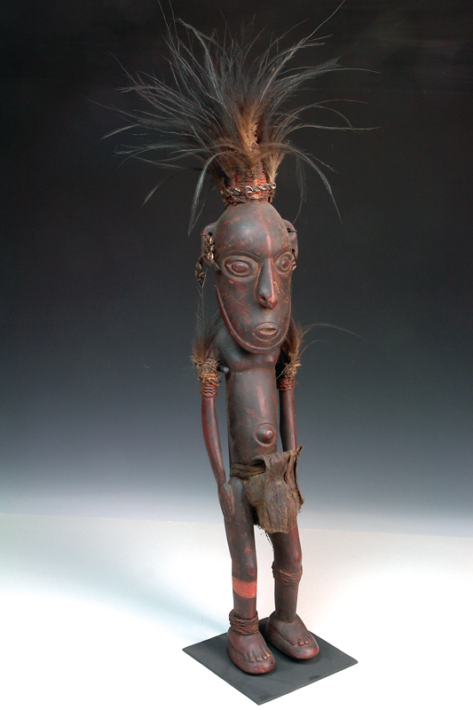 A PNG BLACKWATER RIVER REGION ANCESTOR FIGURE, looped nose, cassowary feather hair, rattan arm and knee bands, bark loincloth, fibre and shell strings at ears, 53cm high