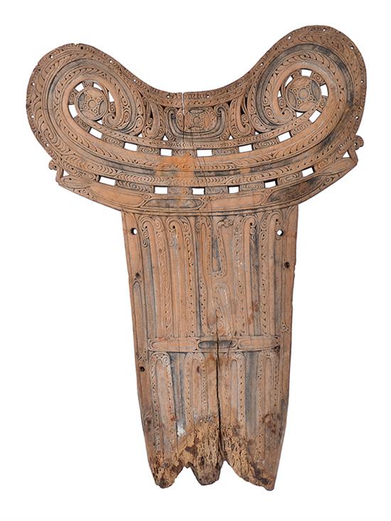 A MASSIM REGION CANOE SPLASHBOARD, CIRCA 1950, heavily carved with incised scroll motif to top, old damage to back, 101 x 71cm
