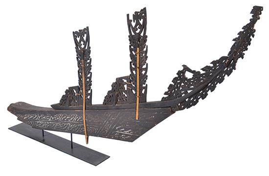 A LARGE GEELVINK BAY CANOE DECORATION, hollow carving, minor faults