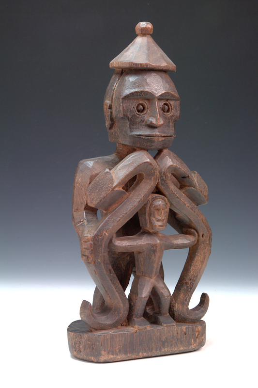 A WEST PAPUA, KORWAR FIGURE, modelled as father and son, open work carving, 30cm high