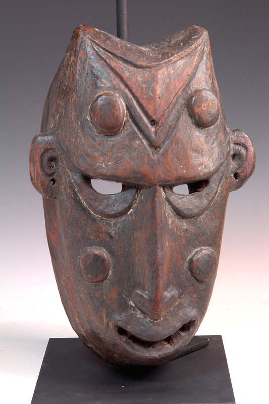 A PNG SAWOS ANCESTOR MASK, MIDDLE SEPIK, open mouth, with teeth, open slit eyes, raised round knobs on forehead, triangles and knobs on cheeks, 33cm high