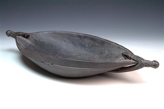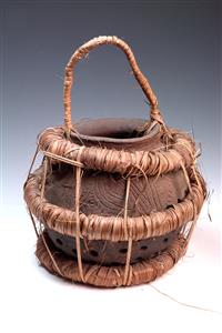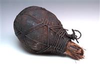 A COLLECTION OF FIVE NEW GUINEA OBJECTS, including West Papuan water calabash, Highlands dance rattle, Highlands oil gourd, Yuat river meat smoking pot, Murik Lake food bowl and carved coconut. The calabash 75 cm long