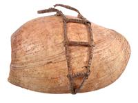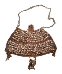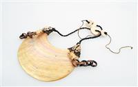 A COLLECTION OF NEW GUINEA BODY ORNAMENTS, including a highlands bailer shell chest ornament, sing-sing festival fibre dance mask, plaited vegetable fibre pouch, Chimbu cassowary crown, highlands fibre belt, gold lip crescent pectoral, nassa shell necklace and sepik forehead decoration. The pectoral 15 cm wide